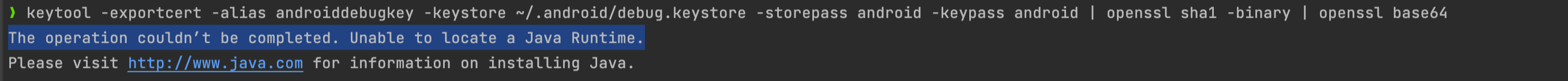 자바가 안 깔려 있었다. 이게 문제라고는 생각도 못했었던 이유는 하필이면 자바 없이도 틀린(적용할 수 없는) 해시키 값이 나왔기 때문이다. 그래서 ssl 자체 문제일 것이라고 생각했었는데,, 후,, 맥북을 최근에(2달 전) 바꿨는데다가 최근에는 수업 듣고 플러터만 하는 중이라 자바가 필요가 없었어서 안 깔았더니 이상한데서 골탕을 먹였다. (자바민국에서 자바 없이 살아남기 실패!) 아무튼 이게 제일 오래 걸려서(하루 왠종일 했다) 굉장히 인상깊었던 에러다.