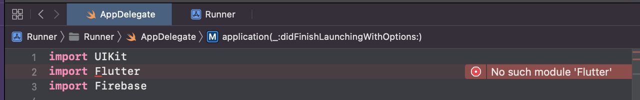 3. iOS>Runner>AppDelegate.swift에서 No such module 'Flutter'
