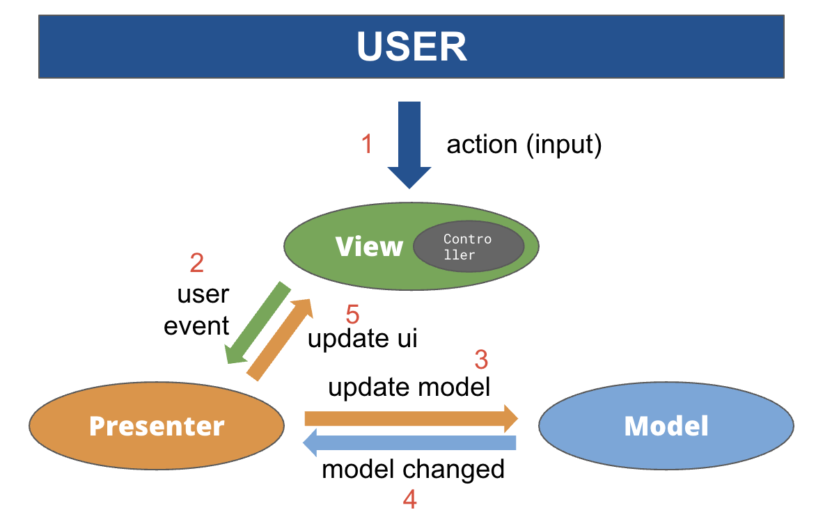 - view에서 요청한 정보로 model을 가공해 view에 전달한다.view에게는 input으로 무엇을 할지 output을 어떤 것을 내보낼 건지에 대한 권한을 주지 않고 다 presenter 단계에서 처리한다.