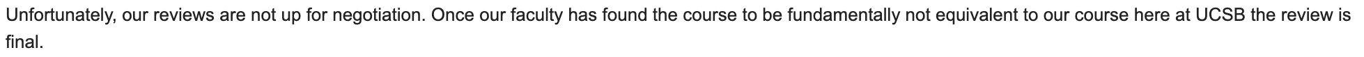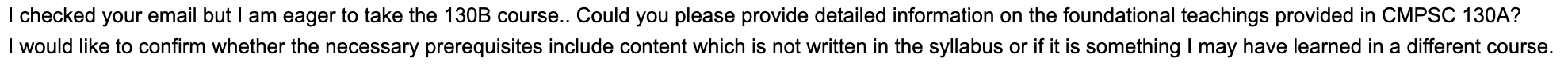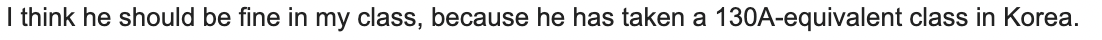 130A 수업을 자료구조 수업으로 대체 받으려고 했는데, 상식적으로 자료구조에 대한 커리는 정말 뻔한데도 저렇게 왔습니다. 진짜 다른 학교에서 자기네 수업과 완전히 "똑같은" 커리를 요구하고 아님 안돼!라고 하는거 너무 열받고요. 참고로 winter 때 이래서 실패한 이 수업 결국 선수과목 인정 받아서 듣고 싶던 수업 spring quarter에 듣고 있습니다. 어떻게냐고요? "교수님께 직접적으로 메일 드리세요"