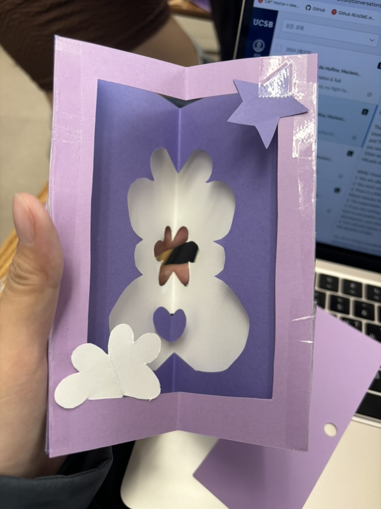 pop up book에 대한 수업입니다. 진짜 귀여워요... 너무너무 사랑스러웠던 수업입니다. 교수님과 같이 덕질하는 기분이에요. 교수님이 실제로 팝업북을 한 50개 가지고 계신데 그걸 수업 중에 가져와서 보여주시고 분석해주십니다. 중간에 직접 만져보고 만들어보는 실습을 하는 시간도 가집니다. 정말 다양한 종류의 paper engineering을 다룹니다. Robert Sabuda나 Matthew Reinhart 같은 유명한 paper engineer 작품들도 다루고 pop up mechanism을 이용한 게임들도 다뤄요. 이번 쿼터에 처음 열렸던 수업이라, syllabus가 완벽하다는 생각은 못 했지만 그만큼 교수님이 수업을 유동적으로 가져가셔서 실제 팝업북들을 만지는 시간이 많았어서 행복했습니다. 중간고사는 하나의 책을 골라서 document하는 것이었고 기말고사는 creative option과 critical option이 있었는데, 마지막까지 고민하다가 정말 좋아하는 게임인 '페이퍼마리오: 종이접기 킹'을 분석하는 페이퍼를 적었어요. 공부하면서 행복한 시간이었습니다. visual narrative 교수님과 같은 교수님이십니다. 학점 잘 주세요.